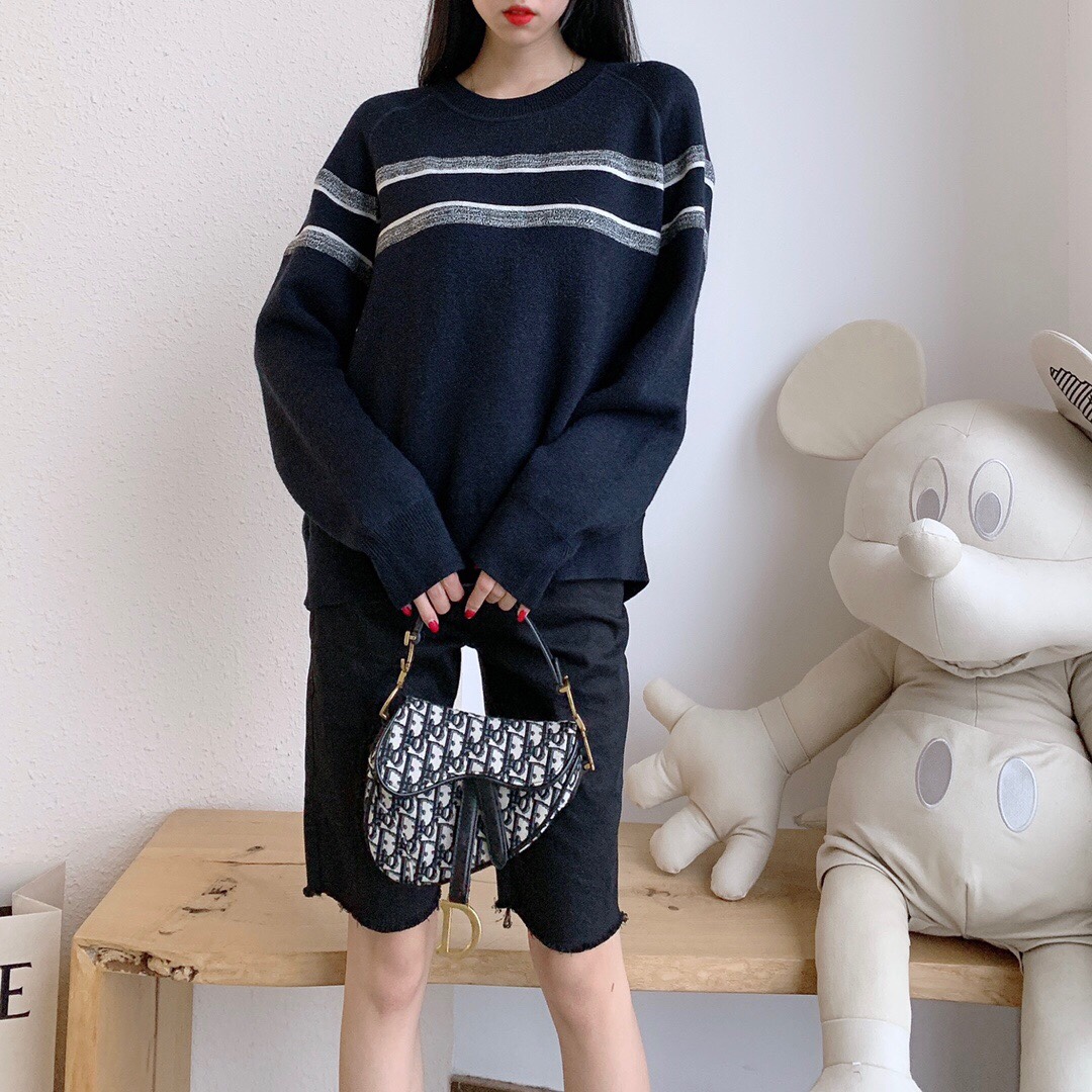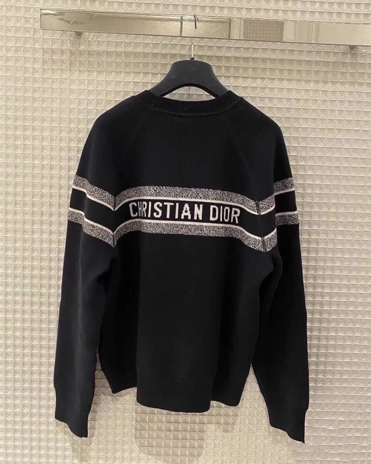 This double – sided knitted sweater combines casual style with practical functionality. It is knitted from a high – tech cashmere blend, featuring a round neck and ribbed cuffs. One side is navy blue, and the other side is adorned with the iconic Oblique print. The striped pattern on the back is embellished with the “Christian Dior” logo, making it stylish and versatile.
