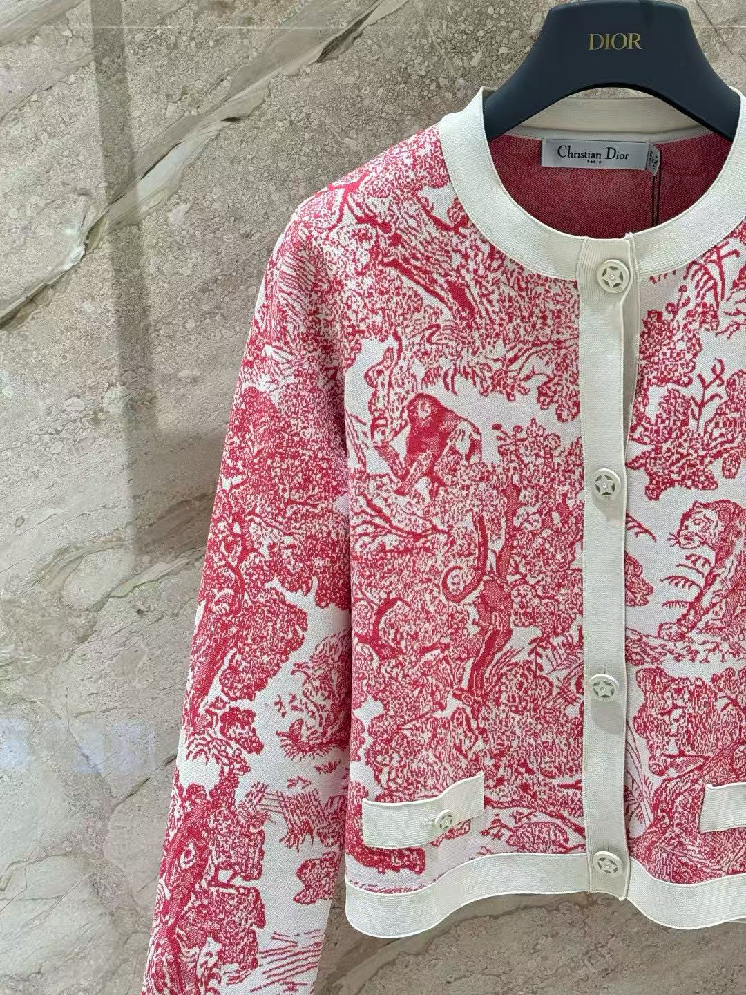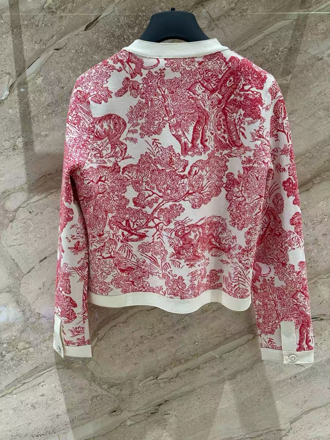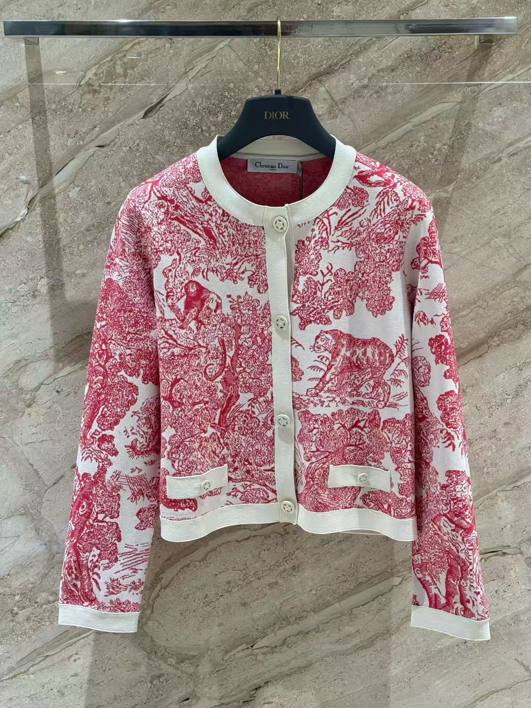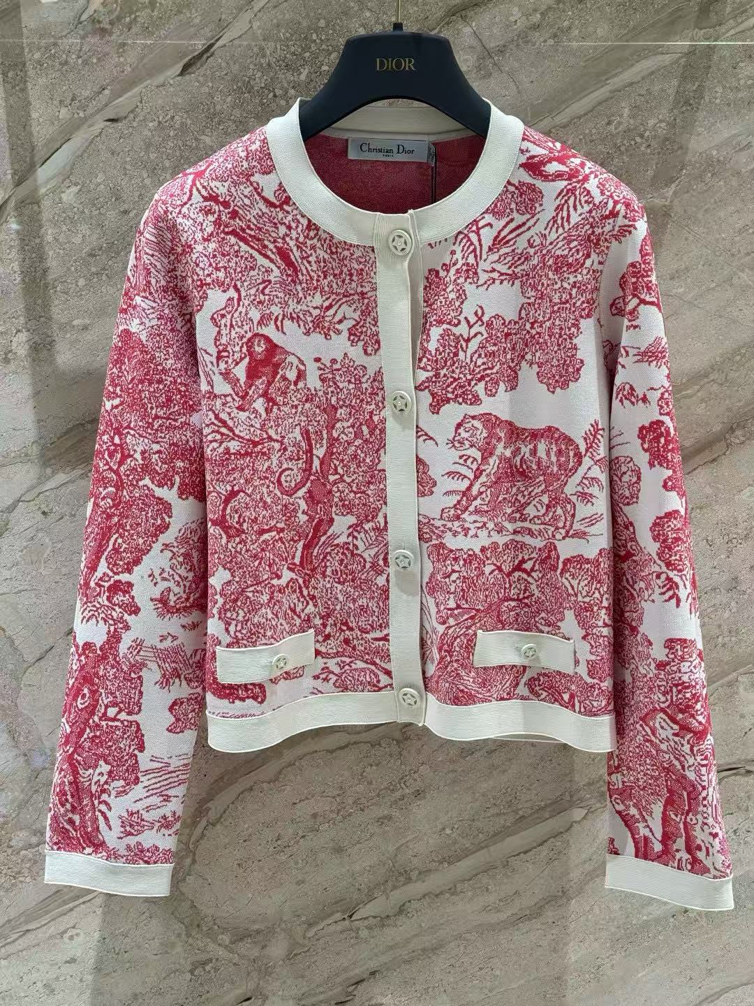 Dior Zoo Knitted Cardigan Early autumn collection. Features a round neck and a single row of buttons. Adorned with zoo jacquard patterns, it boasts a cool and sophisticated color scheme. Made of custom knitted fabric, it feels cool and comfortable. The short fit is slimming and elegant when worn. Complete with all labels. Sizes: S, M, L.