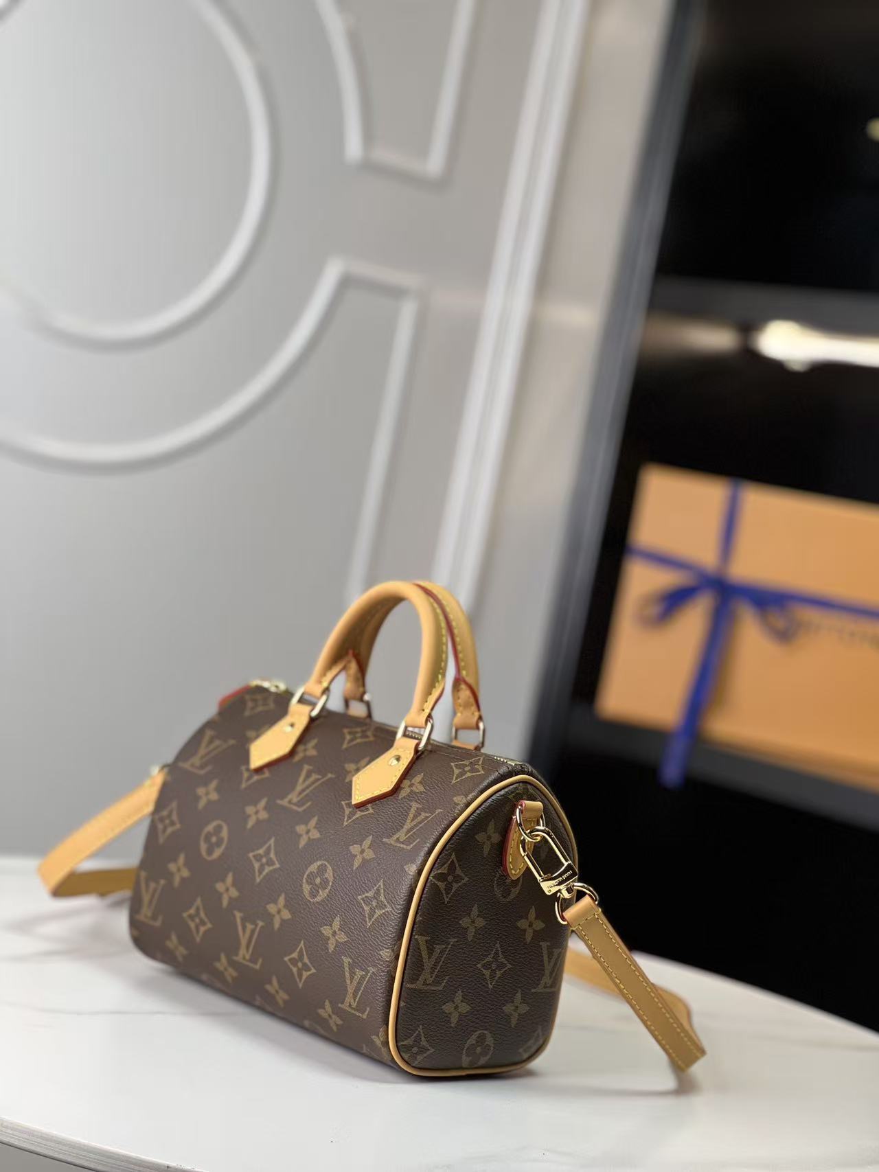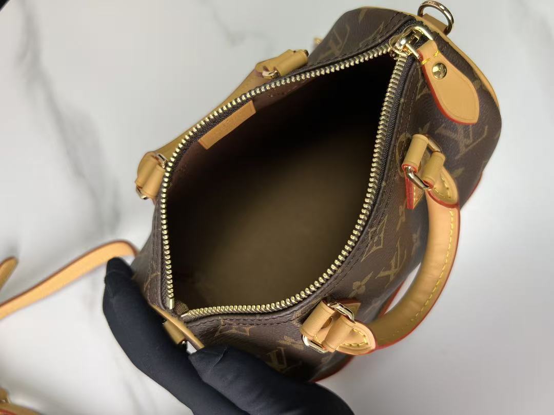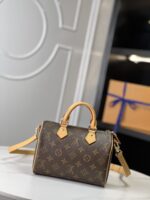 The Speedy handbag condenses the classic silhouette of Louis Vuitton’s Speedy series. It features a compact design crafted from Monogram canvas, complemented by vintage cowhide leather details and metal hardware. The handles and detachable, adjustable shoulder strap enable multiple styling possibilities.