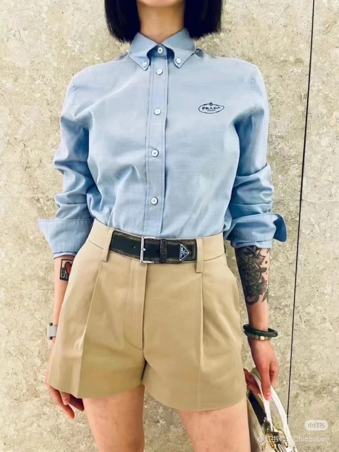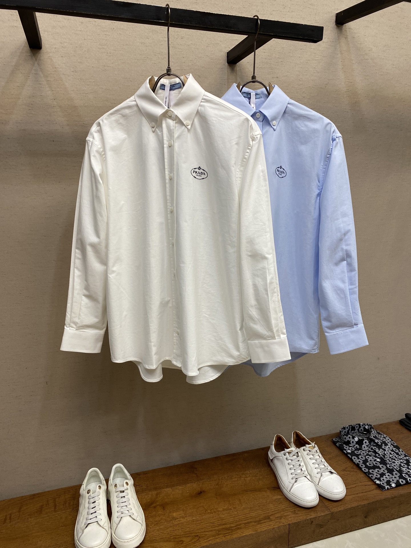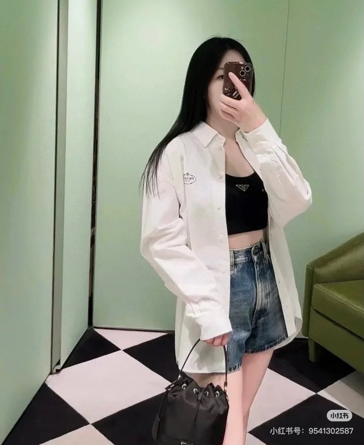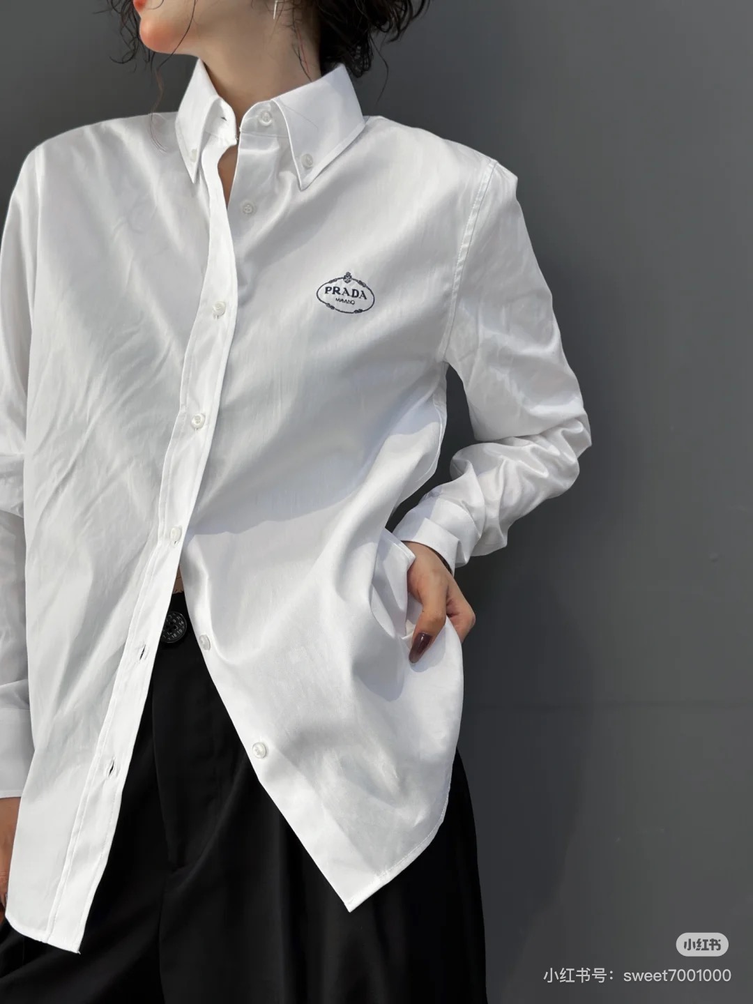 $99????Prada, classic embroidered lapel button long-sleeve shirt. Purchased authentically for 6589. Twill poplin 100% cotton non-stretchy 185g shirt fabric, 75D interlining, hand overlock stitching, imported embroidery, fabric enzyme washing, custom 1:1 buttons, custom 1:1 labels, loose fit.
