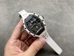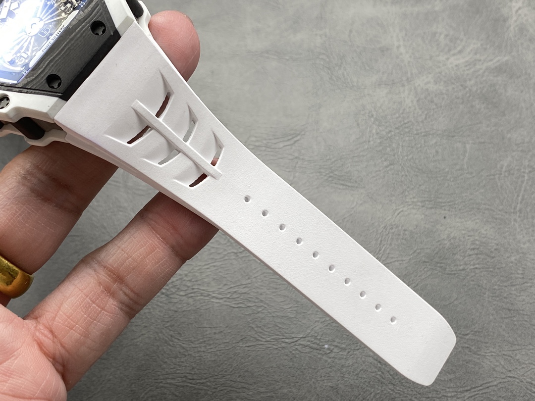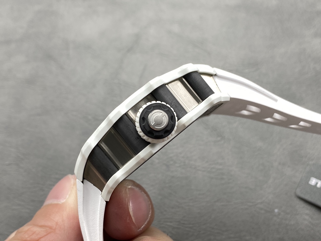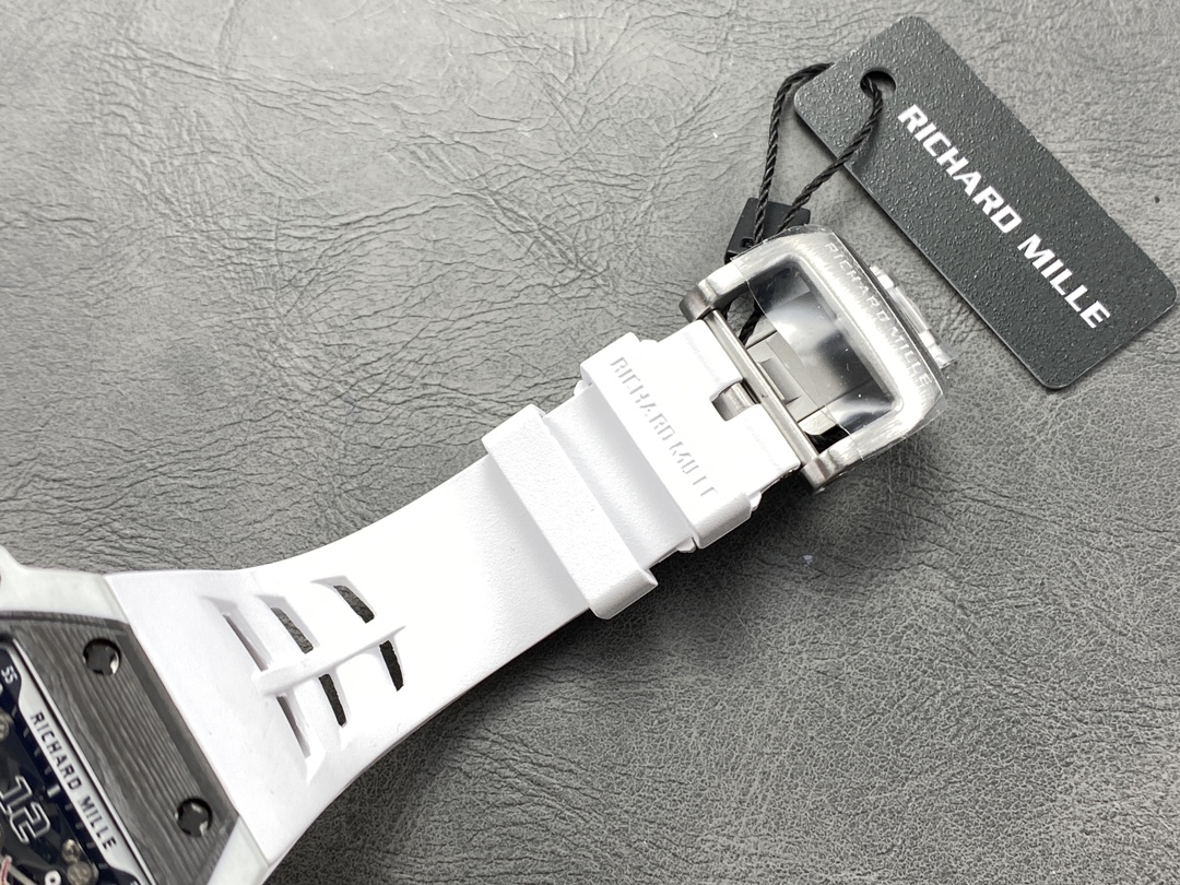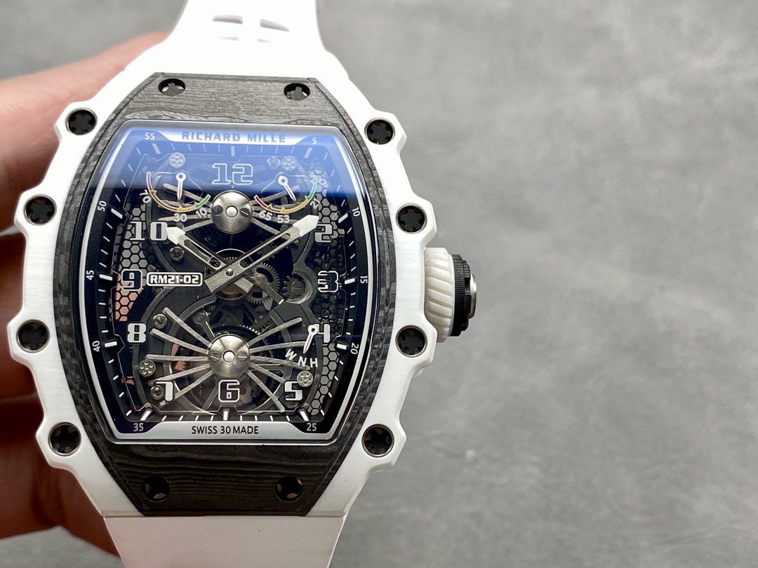 It is equipped with an RM manual-winding movement, featuring a vibration frequency of 28,800 vph and a power reserve of 70 hours. The base plate of this movement is made of carbon fiber and “Haynes 214” high-performance alloy.