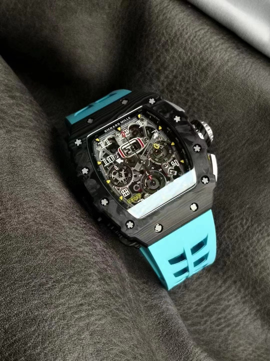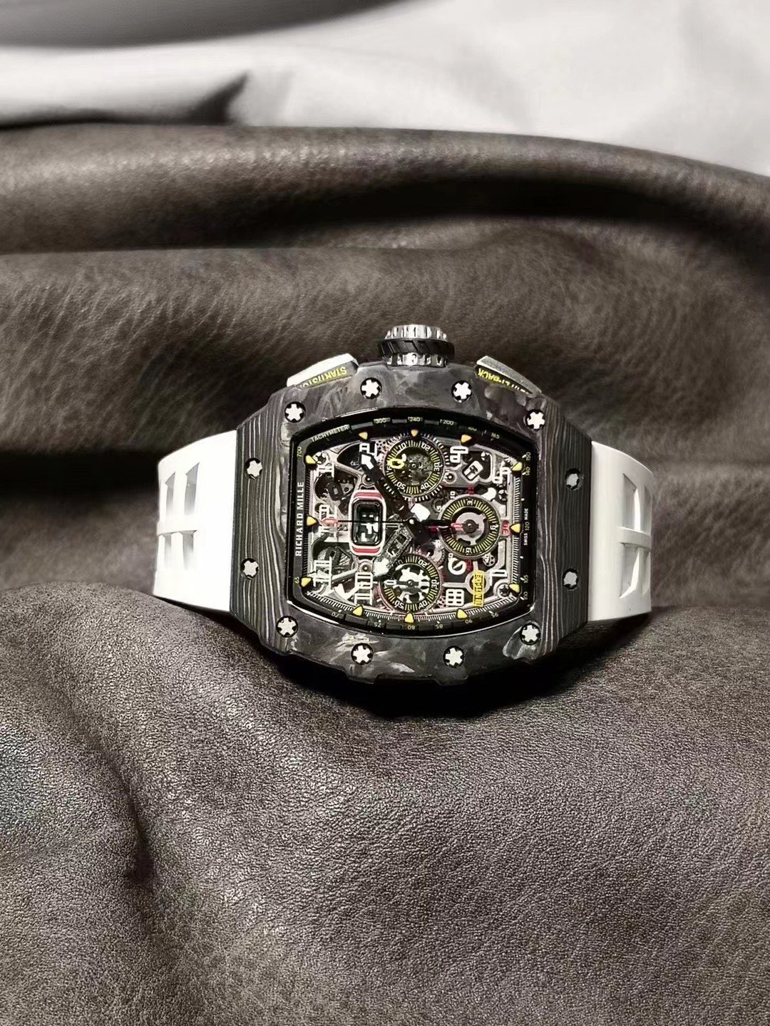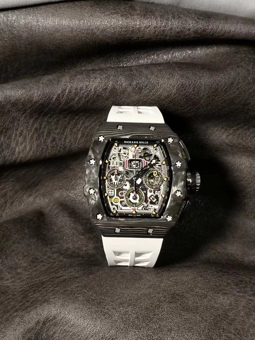 An orange rubber strap paired with a carbon fiber case, featuring a 7750 automatic mechanical chronograph movement.