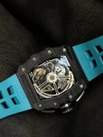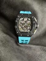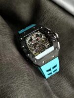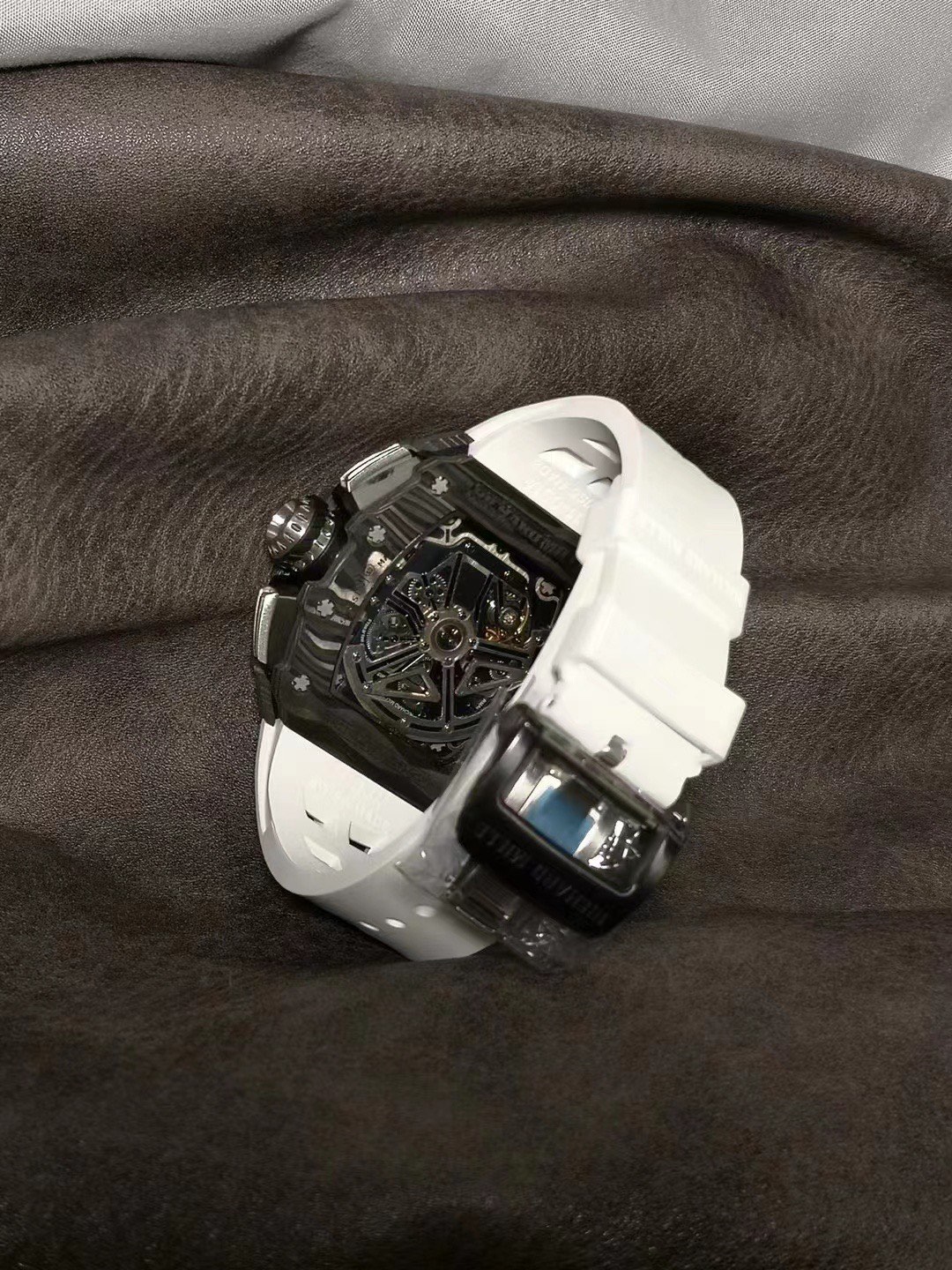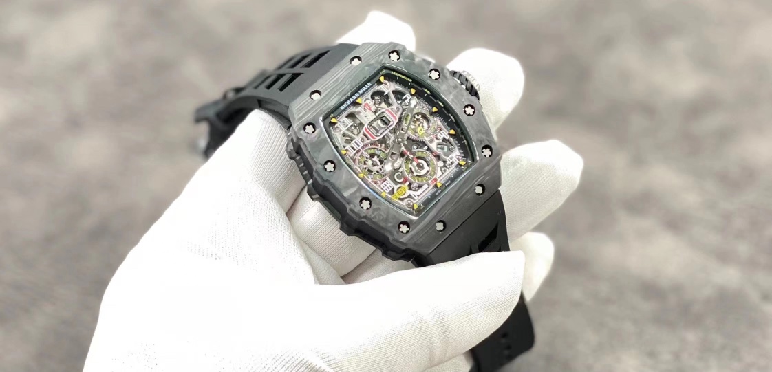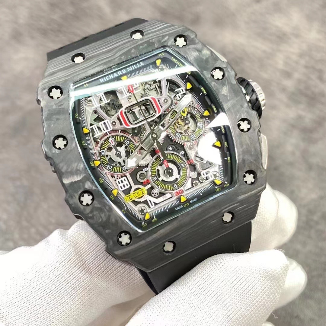 An orange rubber strap paired with a carbon fiber case, featuring a 7750 automatic mechanical chronograph movement.