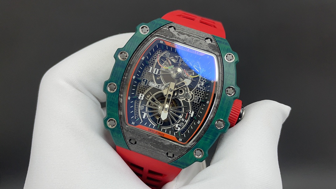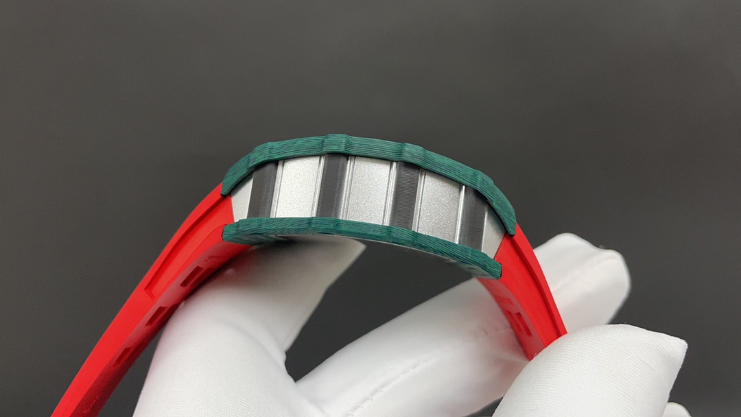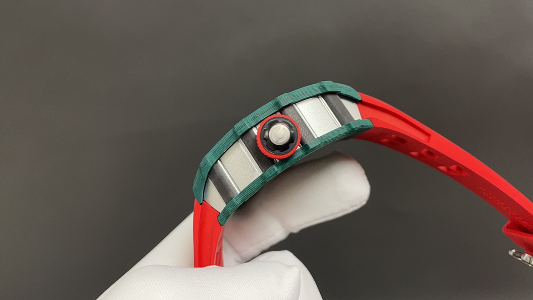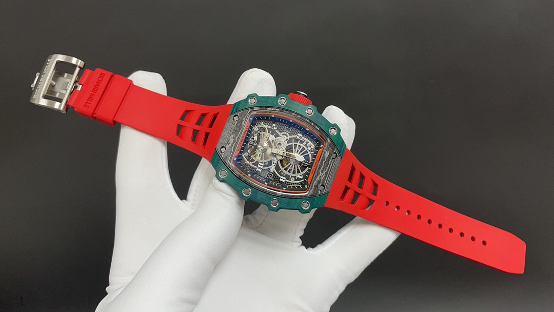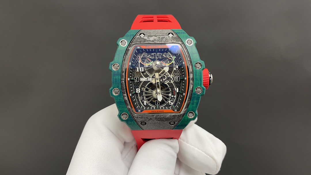 The bezel on both sides and the case back are made of green Quartz TPT® carbon fiber, while the front of the case and the side pillars are crafted from Carbon TPT® carbon fiber.