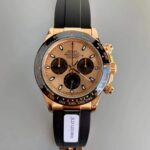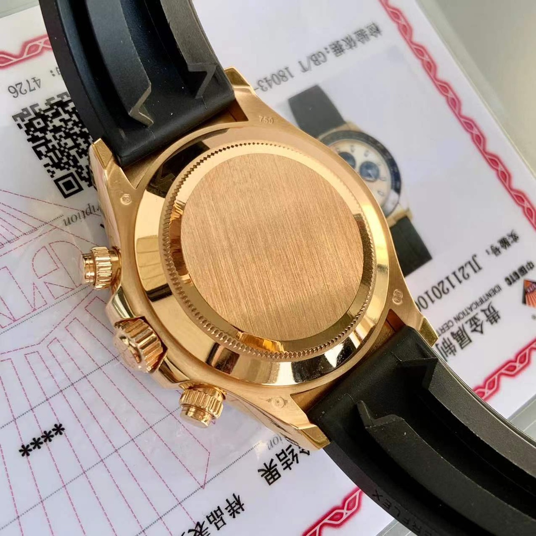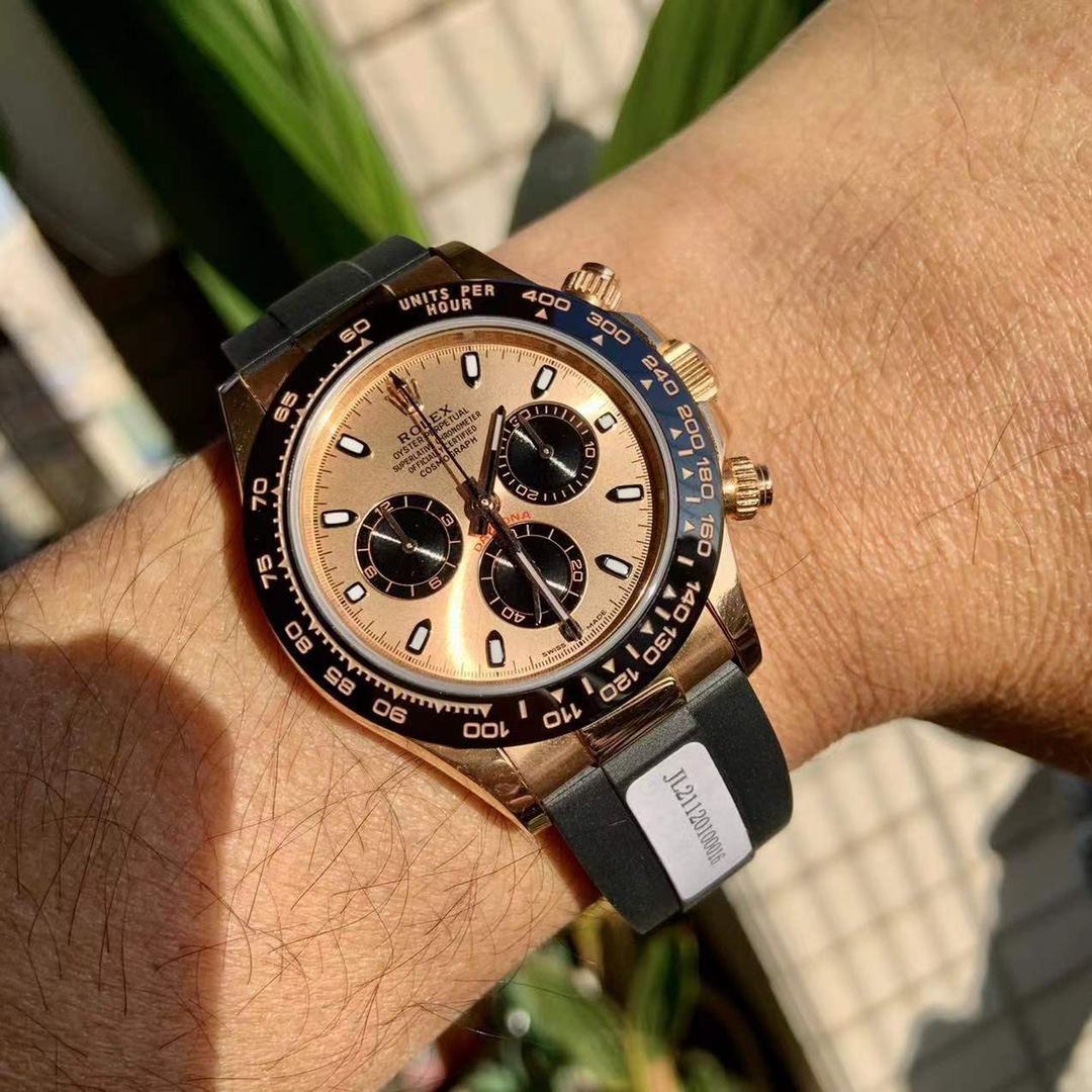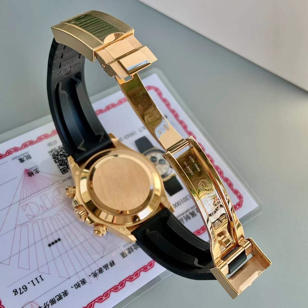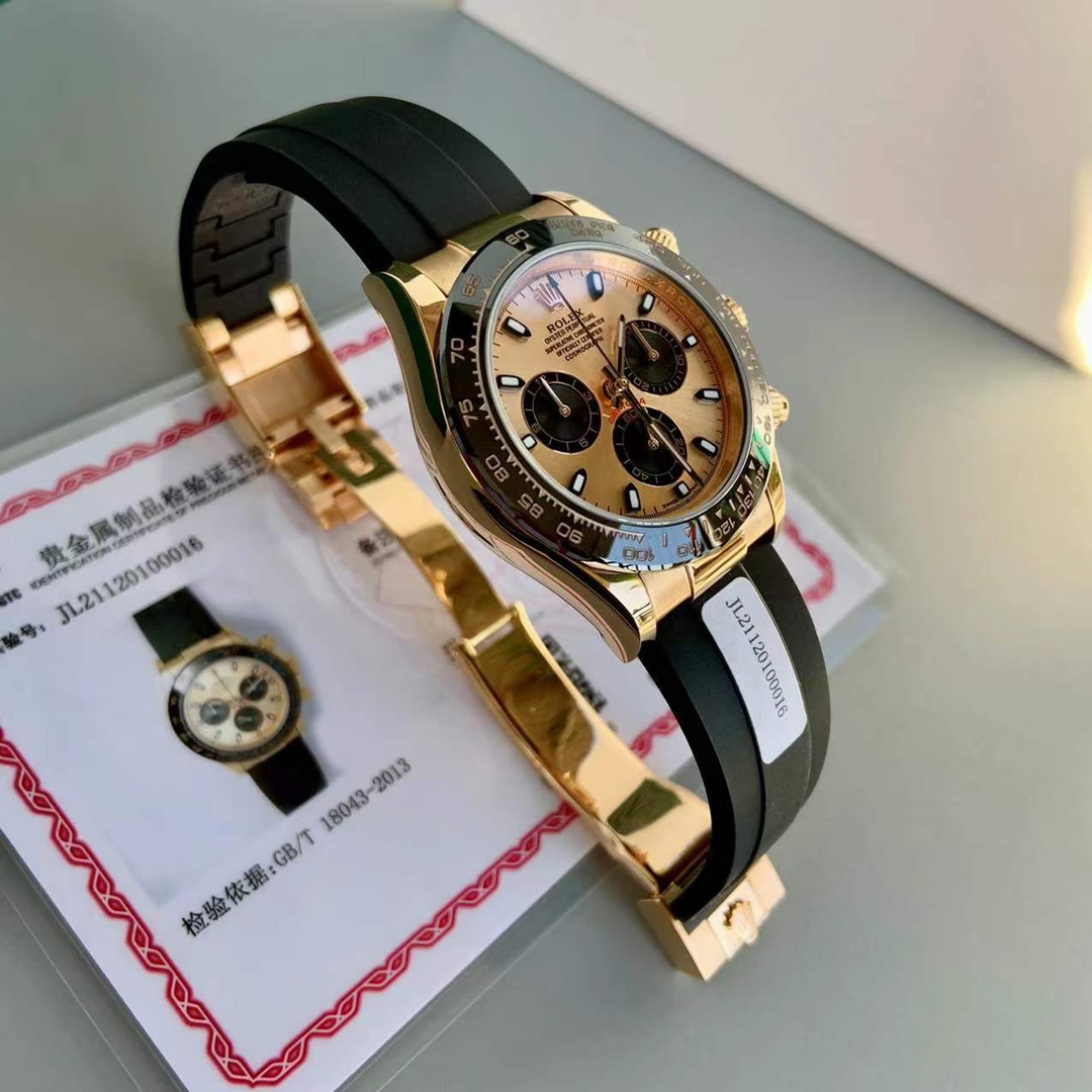 ROLEX. A masterpiece crafted with ingenuity. The customized gold-clad version of Rolex Daytona, each watch undergoes strict inspection. The case is molded according to the original version, with a dial size of 40mm. The thickness is currently the closest to the original on the market. The ceramic solid bezel with tachymetric scale (adopting real ceramic technology, scratch-resistant, never fading, with the same texture as the genuine product). The fonts on the function dial and the logo on the dial are made using overlay printing technology, which gives a slightly raised feeling when observed from the side. The background texture of the dial has undergone countless filtering and corrections to ensure 100% consistency with the original. The Rolex metal LOGO on it is separately molded, and both its three-dimensional effect and roundness can compete with the original. Easy-to-read Chroma light luminous display with long-lasting luminous material. The watch mirror is flat sapphire crystal glass, scratch-resistant, with no ghosting effect, consistent with the genuine product. ?? The small crown ?? with anti-counterfeiting feature at the 6 o’clock position is consistent with the genuine product (pay attention to the details). The clasp is made of imported high-quality steel with 1:1 parts polished, with brushed inner side, etched Rolex steel stamp, and an external clasp safety ring exactly the same as the genuine product, achieving perfection in every detail! Comes with a full set of top-level packaging!